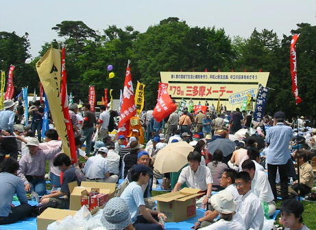 世界をつなげ花の輪に、人間の歌、がんばろうなどうたごえ協議会を中心に舞台の上で演奏したり、歌でデモ行進を送り出したりしました。